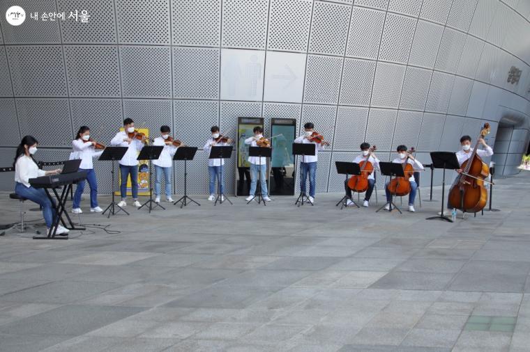 하트하트오케스트라의 현악앙상블이 어울림광장에서 연주하고 있다. ⓒ이선미