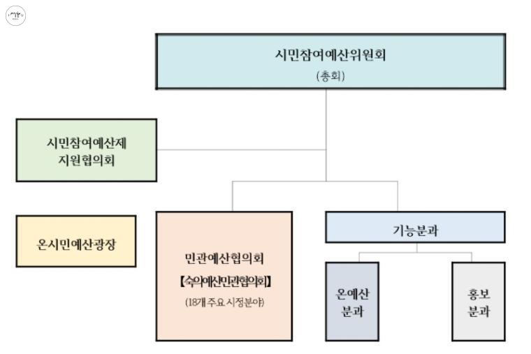 서울시 시민참여예산위원회는 총회, 민관예산협의회, 온예산분과, 홍보분과, 시민참여예산지원협의회로 구성되어 있다. 이 중 민관예산협의회(숙의예산민관협의회)는 18개 분야(민주서울, 여성, 복지, 환경, 시민건강, 노동민생, 안전, 교통, 문화, 관광체육, 주택, 도시재생, 공원, 경제, 스마트도시, 교육, 물순환안전, 한강)로 세분화돼 활동한다.
