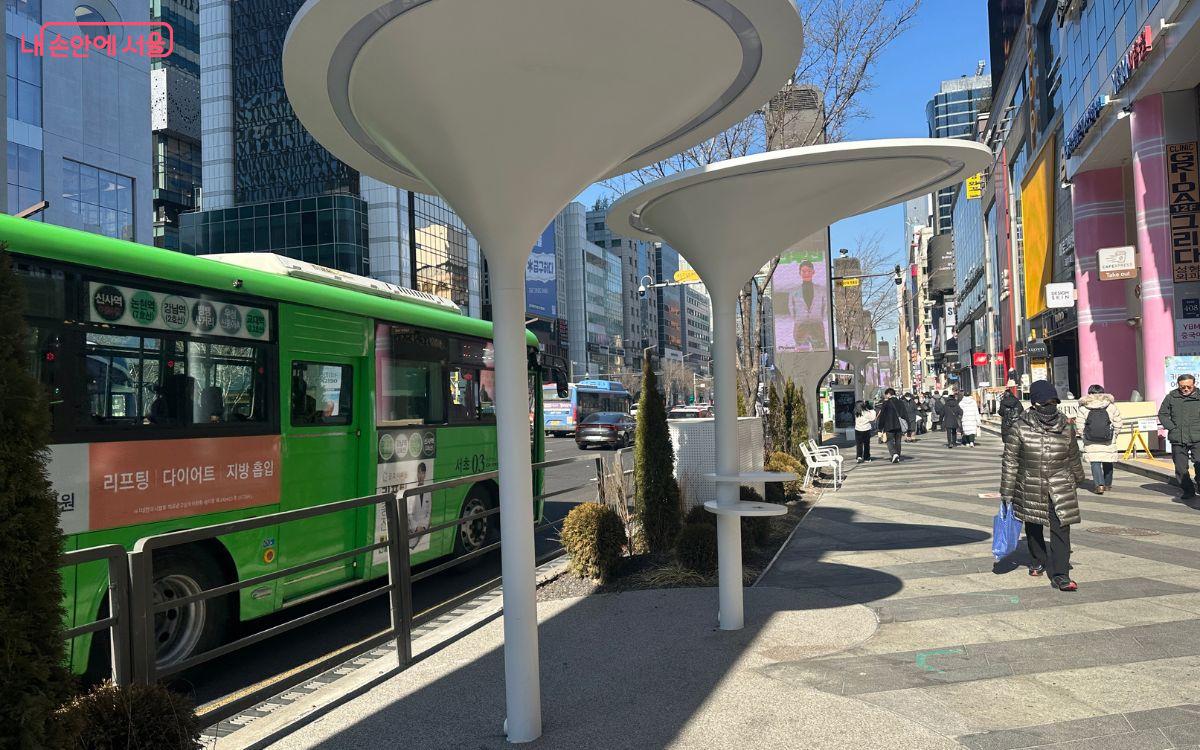 특히, 강남대로 곳곳에 새롭게 설치된 17개의 그늘막은 보행자들에게 편리한 휴식 공간을 제공한다. 하얀 버섯 모양이 독특하다. 일부 대형 그늘막에는 태양의 위치에 따라 회전하는 스마트 전동 캐노피 기술이 적용됐으며, 무선 휴대폰 충전 기능도 함께 제공해 보행자의 편의성을 높였다.