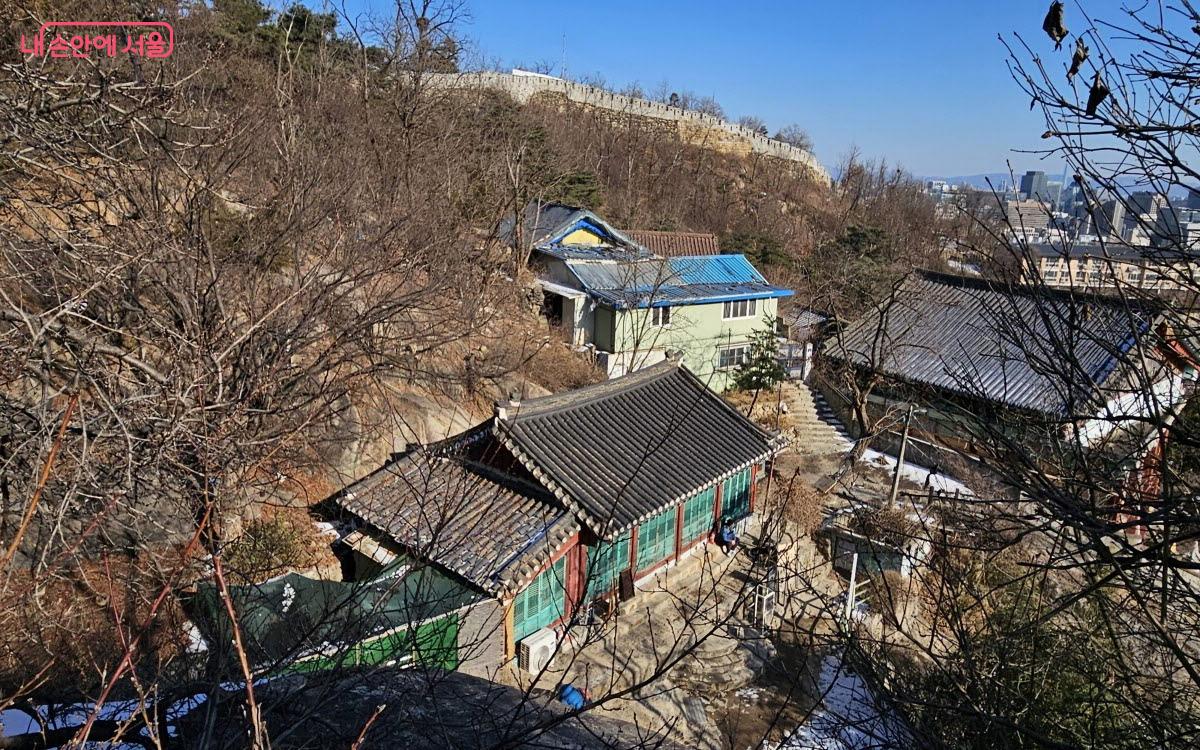 선바위로 올라가면서 내려다본 국사당. 그 위로 성곽이 이어져 있다. ©이선미