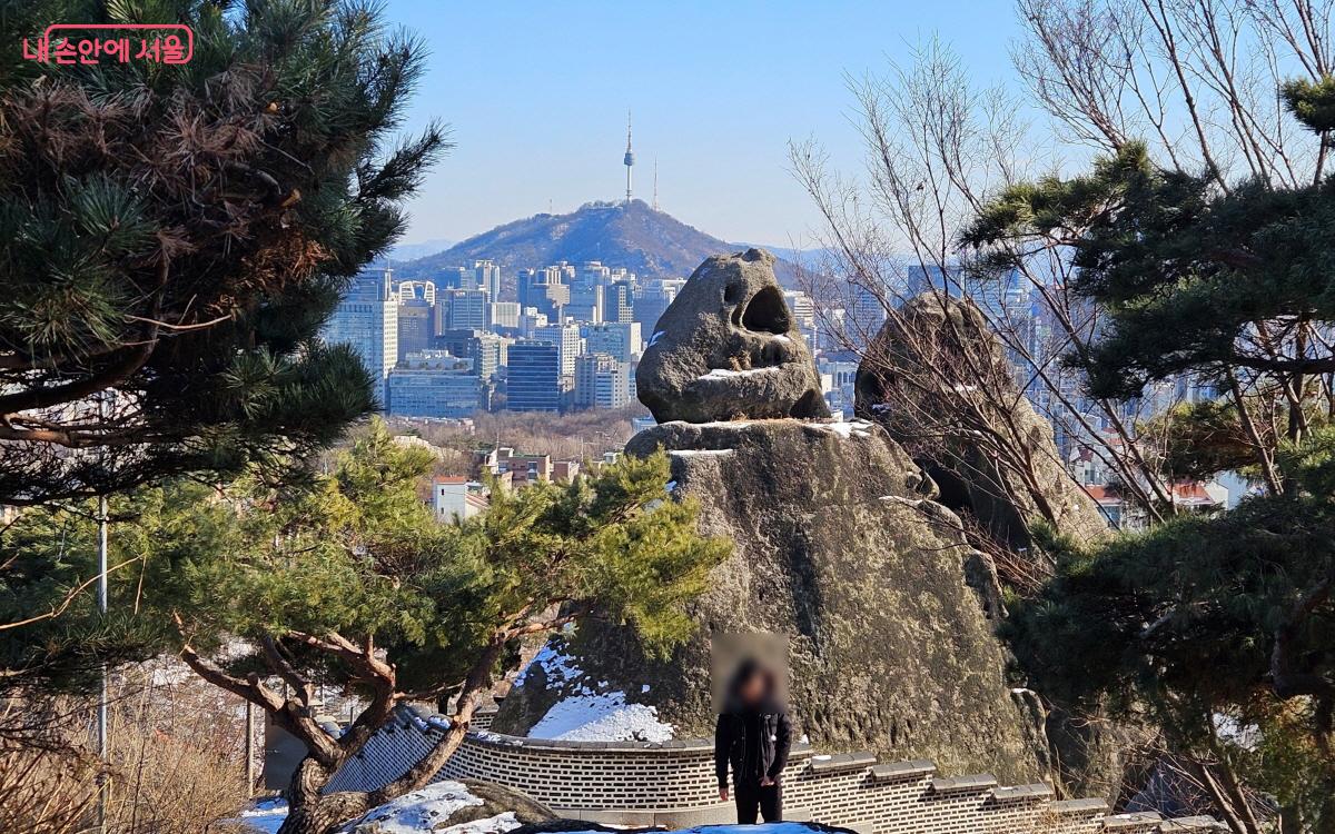 수많은 세월 풍화된 바위는 범접이 어려운 느낌도 드는데 바위의 옆모습과 뒷모습은 또 다른 분위기가 배어나온다. 뒤로 돌아가 소나무 옆에 서니 저 멀리 남산타워가 내려다보인다.