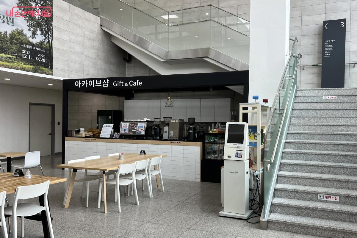 3층으로 올라가는 계단 옆에 음료와 굿즈를 파는 숍이 있다. ©박지영