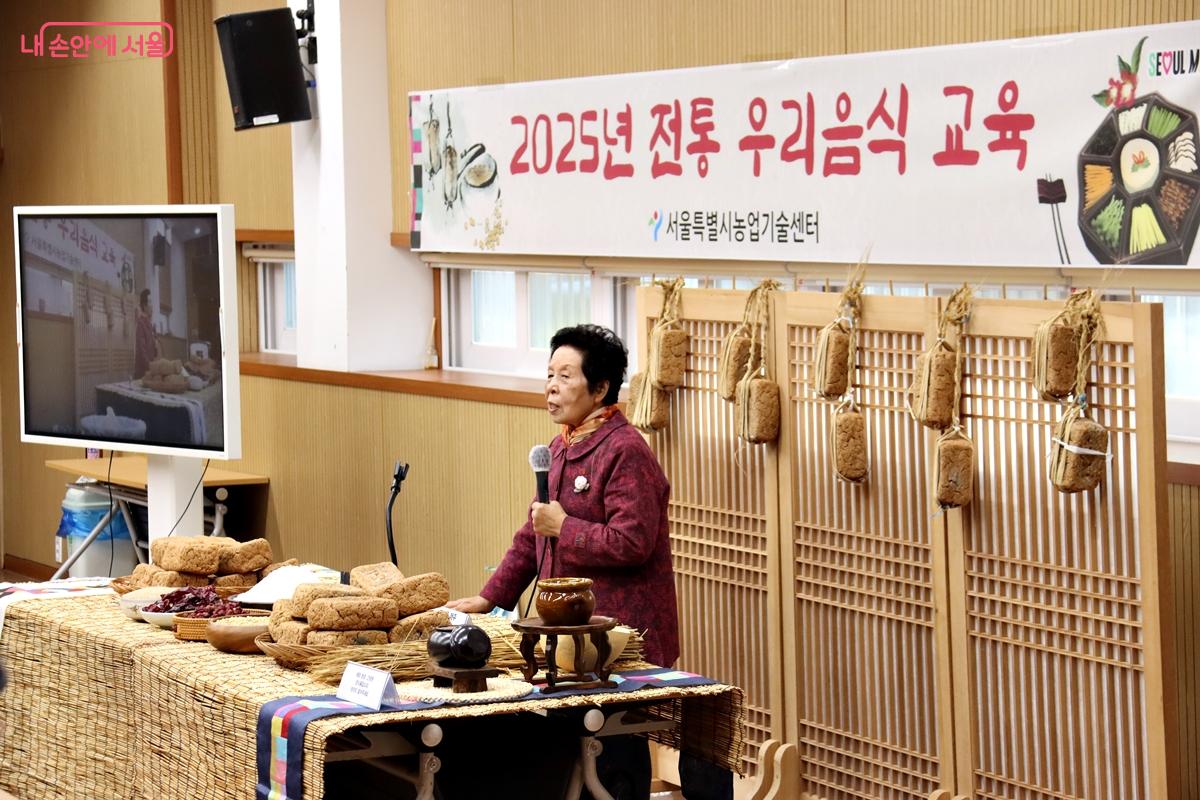 3대째 전통 장 담그기 내림 솜씨를 보유한 조숙자 명인이 강의했다. ©정향선