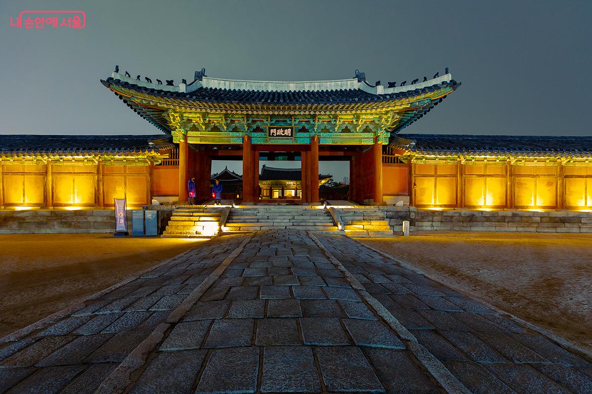 명정문과 명정전, 두 건축물이 어두운 밤하늘 아래 환하게 불을 밝히며, 마치 수백 년의 역사를 품고 살아 숨 쉬듯이 찬란하게 빛나고 있다. ©문청야