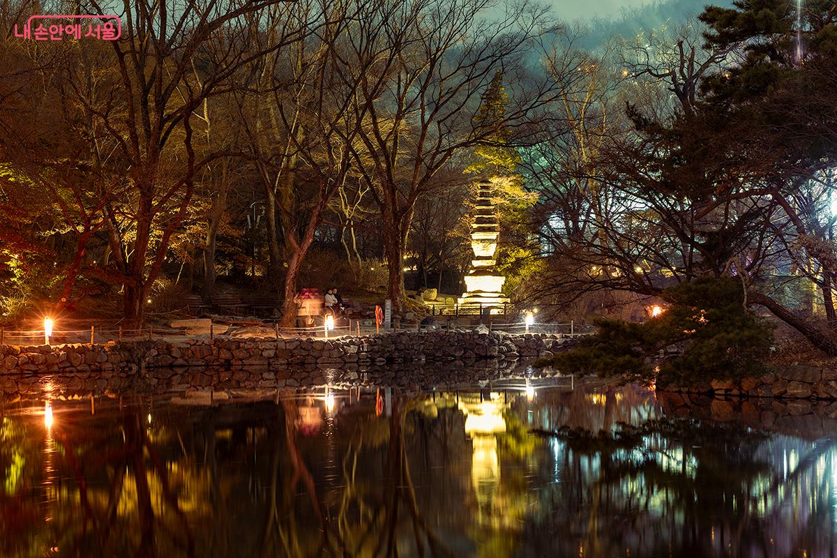 창경군 춘당지가 빛으로 물들어 화려한 가운데 산책로는 고요하기만 하다. ©문청야