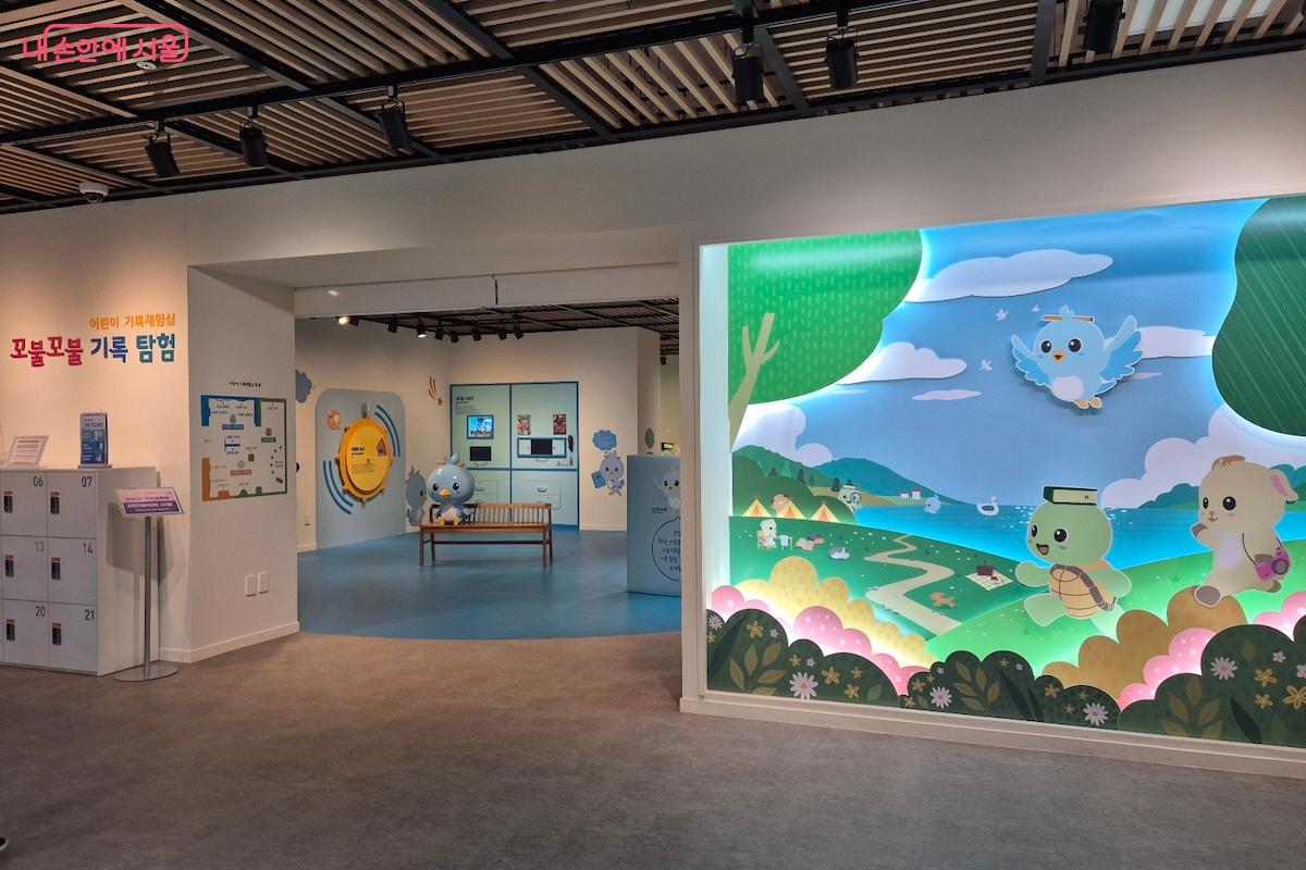 체험 전시 '꼬불꼬불 기록 탐험' 입구, 왼편에 물품보관함, 오른편에 전시 캐릭터들이 있다. ©엄지은