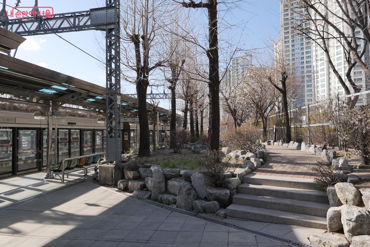 열차가 신답역에 도착한다. 선두 객차의 출입문과 스크린도어가 동시에 열리면 승강장에서는 뜻밖의 풍경이 펼쳐진다. 익숙한 승강장의 구조가 아닌 나무가 있는 정원이 보인다.