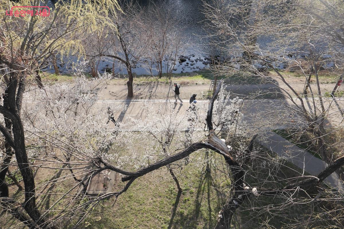 이번에는 내부 계단을 따라 올라가서 용답역 2번 출구로 나오는 것을 추천한다. 출구는 천변 산책로보다 훨씬 높은 곳에 있어 청계천과 매화가 핀 하동매실거리를 내려다볼 수 있다. 봄이 시작되는 풍경에 흡족하게 만든다.