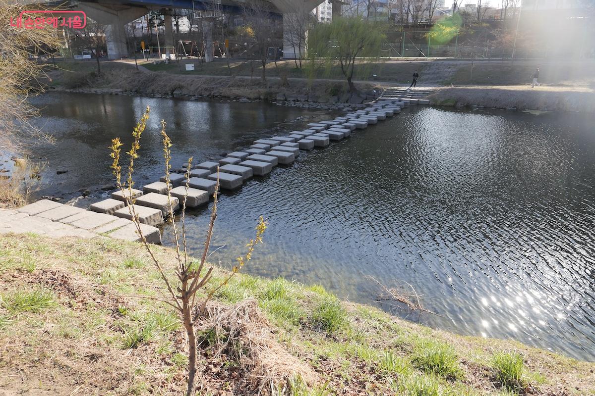 용답동과 사근동을 잇는 용답나들목교 주변에는 징검다리가 있어 건널 수 있다. 오후에 다리 주변에 윤슬이 반짝일 때는 건너는 이도 풍경이 된다.