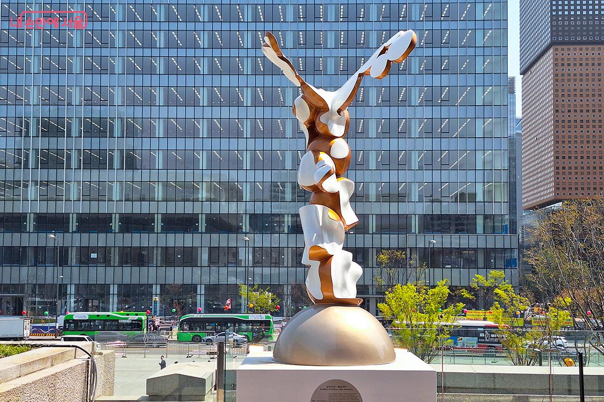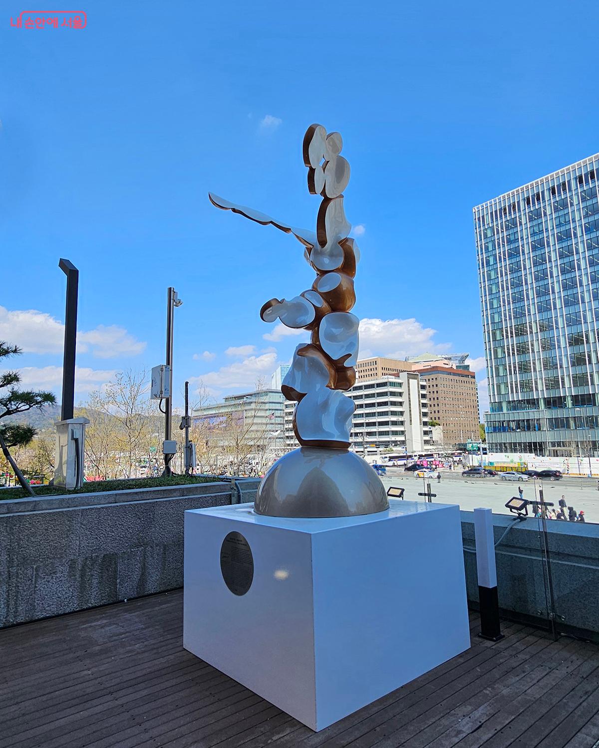가장 먼저 찾은 광화문 세종문화회관 2층 테라스에서 안경진 작가의 작품 <승리의 여신 새로운 변주>를 만났다. 고대 조각을 떠올리게 하는 형태가 익숙한 듯 낯선 형상으로 관람자의 시선을 끌어당겼다. ‘여신’이라 부를 만한 존재가 새로운 색과 질감으로 다시 태어난 듯했고, 전통성과 현대성이 절묘하게 교차하는 지점에서 추상의 미가 한껏 느껴졌다.