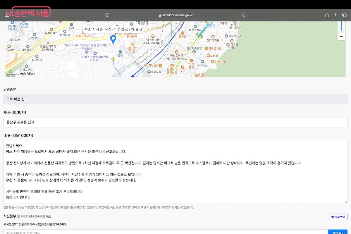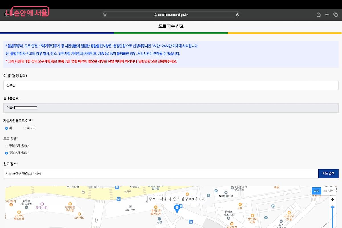 카카오톡 내 서울시 대표 챗봇 '서울톡' 서비스를 통해 포트홀 신고를 직접 진행해보았다.