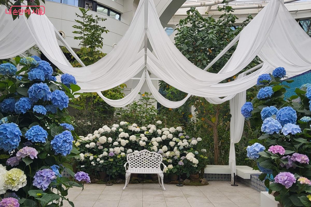 이곳에서 가장 눈에 띄는 곳은 '로맨틱 포토존'이다. 파란빛 수국이 아치형으로 흐드러지게 피어 있고, 그 아래 하얀 나무 벤치가 놓여 있다. 그야 말로 수국 천국에서 멋진 사진을 남기고자 하는 시민들이 길게 줄지어 서있다. 이곳에선 누구나 동화 속 주인공이 될 듯하다.