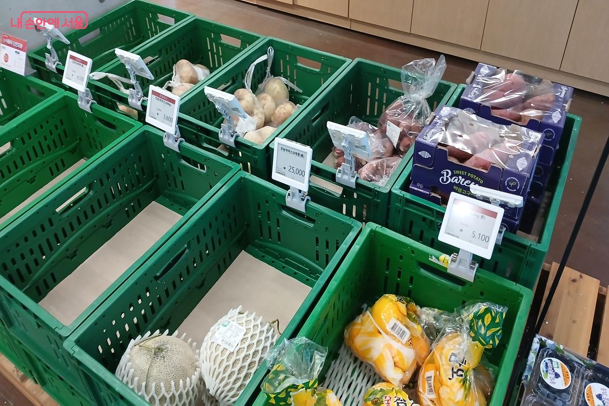 야채 및 과일 코너. 문을 닫을 시간에 방문해서인지 이미 많은 식품이 팔렸다. ©유지민
