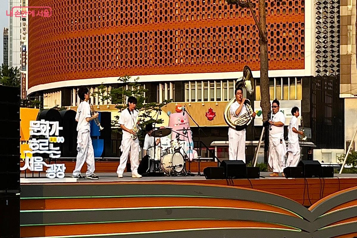따사로운 햇살을 머금고 새싹이 돋아나기 시작한 지 얼마 되지 않았는데 벌써 몇 번의 봄비가 추적추적 내리고 어느새 무더운 여름 날씨가 찾아오고 있다. 한동안 무더위를 겪어야 할 시민들은 날이 좋을 때 조금이라도 더 움직이려는 모양인지 거리가 사람들로 북적인다. 서울광장 거리는 서울 중심지로 출퇴근하는 많은 시민들이 지나가는 곳이다. 5월 21일 '문화가 흐르는 서울광장'에서는 우천 취소 행사 제외 네 번째 공연인 브라스밴드 ‘붐비트’의 신명나는 퍼포먼스가 펼쳐졌다. ☞ [관련 기사] 5월 나들이 고민은 넣어둬! 힐링이 되는 축제 모음