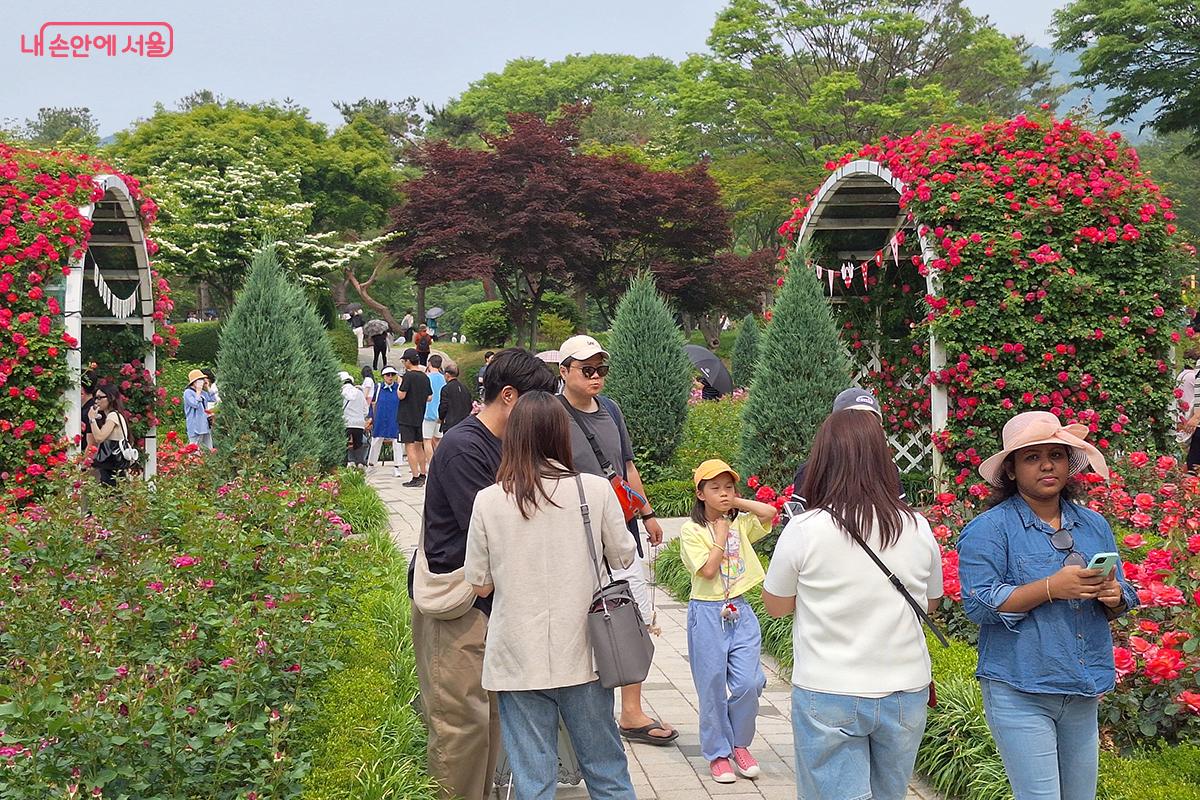 붉은 장미와 사람들의 미소가 어우러진 정원의 풍경이 아름답다. ©정향선