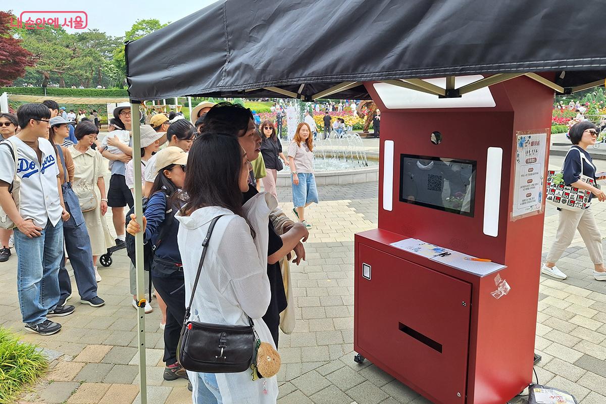 '뉴스페이퍼 포토 부스'에서 자신만의 커스텀 장미 사진을 찍는 시민들의 모습 ©정향선