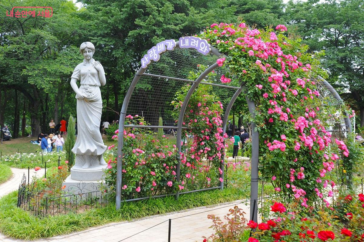 푸른 수목과 조형물과 장미가 어울리는 장미원 3단지 풍경 ⓒ조수봉