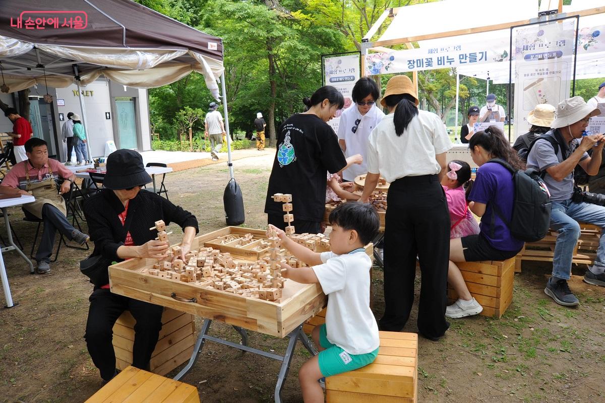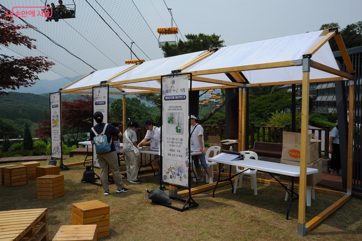 장미원 3단지 옆 공터에서는 꽃 책갈피 만들기, 컬러링 테이블, 장미꽃 비누 만들기, 목공 원데이 클래스가 진행된다. ©조수봉
