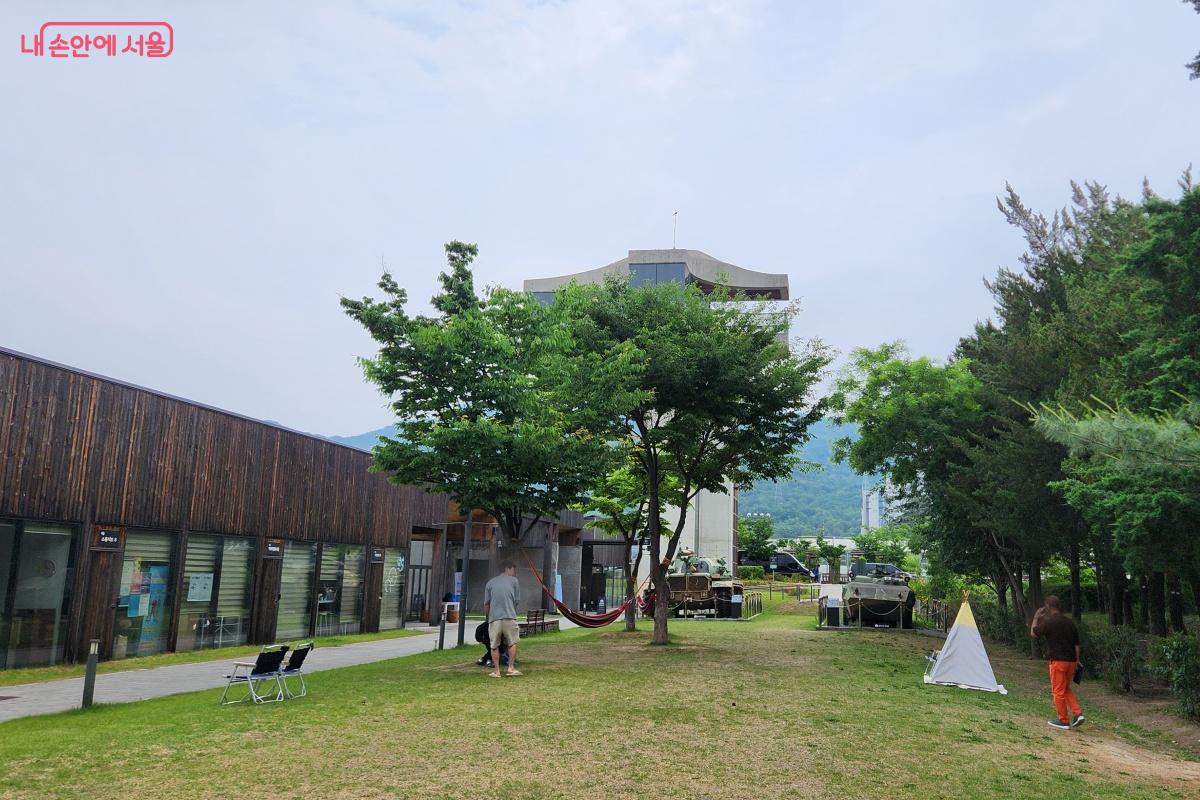 지하철 7호선 1-1번 출구 평화문화진지도 또 하나의 볼거리다. 대전차 방호시설의 흔적들을 보존한 채 시민문화창작공간으로 재탄생시킨 곳이다. 베를린장벽의 일부가 설치되어 있고, 길게 붙어 있는 구조로 높지 않아 주변 경관과 조화롭게 어우러진다. 2층 옥상으로 올라가면 과거 군사시설임을 짐작할 수 있는 구조물이 보인다. 평화전망대에 오르면 울창한 서울창포원과 평화광장이 한눈에 들어온다.