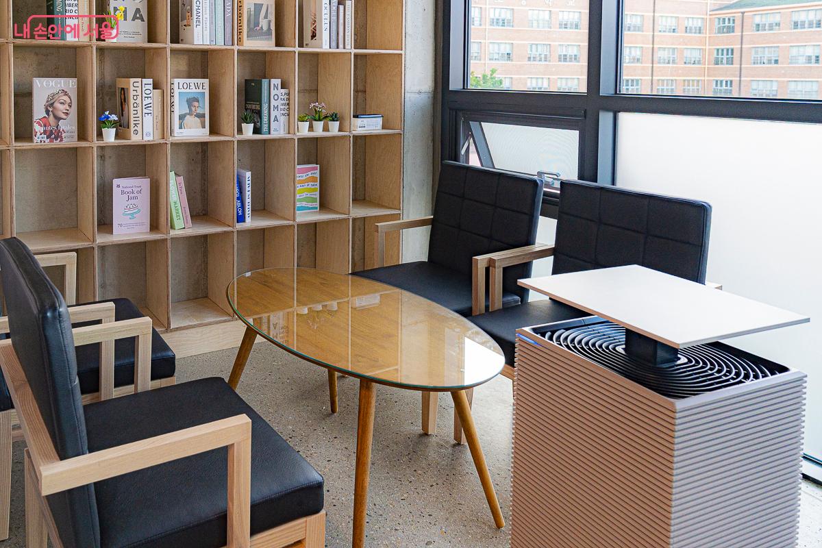 2층은 별도 예약 없이 이용 가능한 오픈 라운지로, 성북구의 풍경을 내려다볼 수 있는 창가 좌석과 넓고 편안한 테이블석이 마련돼 있다. 라운지 한쪽에는 정수기, 싱크대, 텀블러 세척기, 커피메이커, 공용 컵까지 갖춰져 있어 간단한 음료 섭취와 정리가 가능하다. 가장 놀라운 점은, 흑백 프린트물을 1인당 최대 30매까지 무료 인쇄할 수 있다는 것이다. 1층 운영사무실에서 인쇄 대장을 작성하면 누구나 이용할 수 있다.