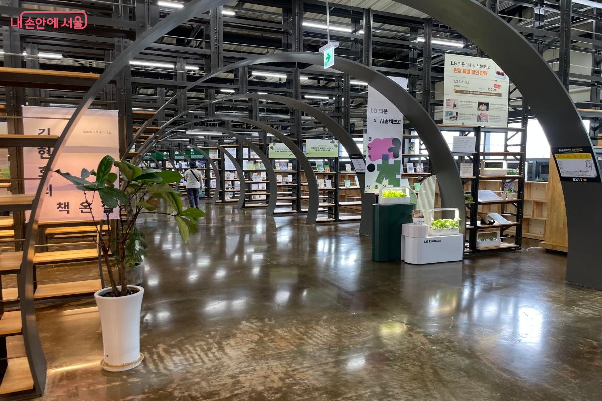 문을 열고 들어서자 서울책보고의 대표 명물인 아치형 철제 서가가 여전히 신비로운 분위기를 내뿜고 있다. 헌책이 빼곡히 꽂혀 있던 예전 모습과 달리 감각적으로 큐레이션 되어 있는 책들이 눈에 띄었다.