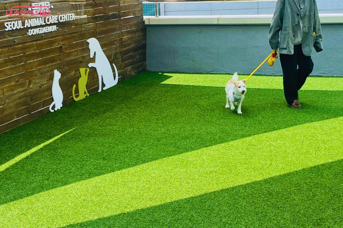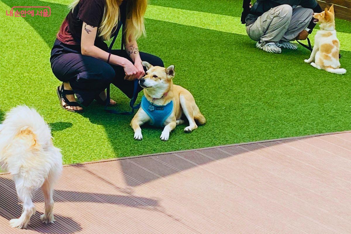 실내 수업이 마무리된 후, 반려견들의 집중력을 회복하기 위한 휴식 시간이 주어졌다. 교육 시간이 길어질수록 반려견이 지치거나 산만해지기 쉽기 때문에, 수업 중간중간 적절한 휴식 시간을 준다고 한다. 서울시립동물복지지원센터 동대문지점 옥상에 마련된 야외 운동장에서 자연스럽게 수업이 이어졌다. 햇볕과 바람이 어우러진 공간에서 반려견은 물도 마시고, 보호자와 함께 산책하며 긴장을 충분히 푼 뒤, 다시 훈련이 이어졌다.