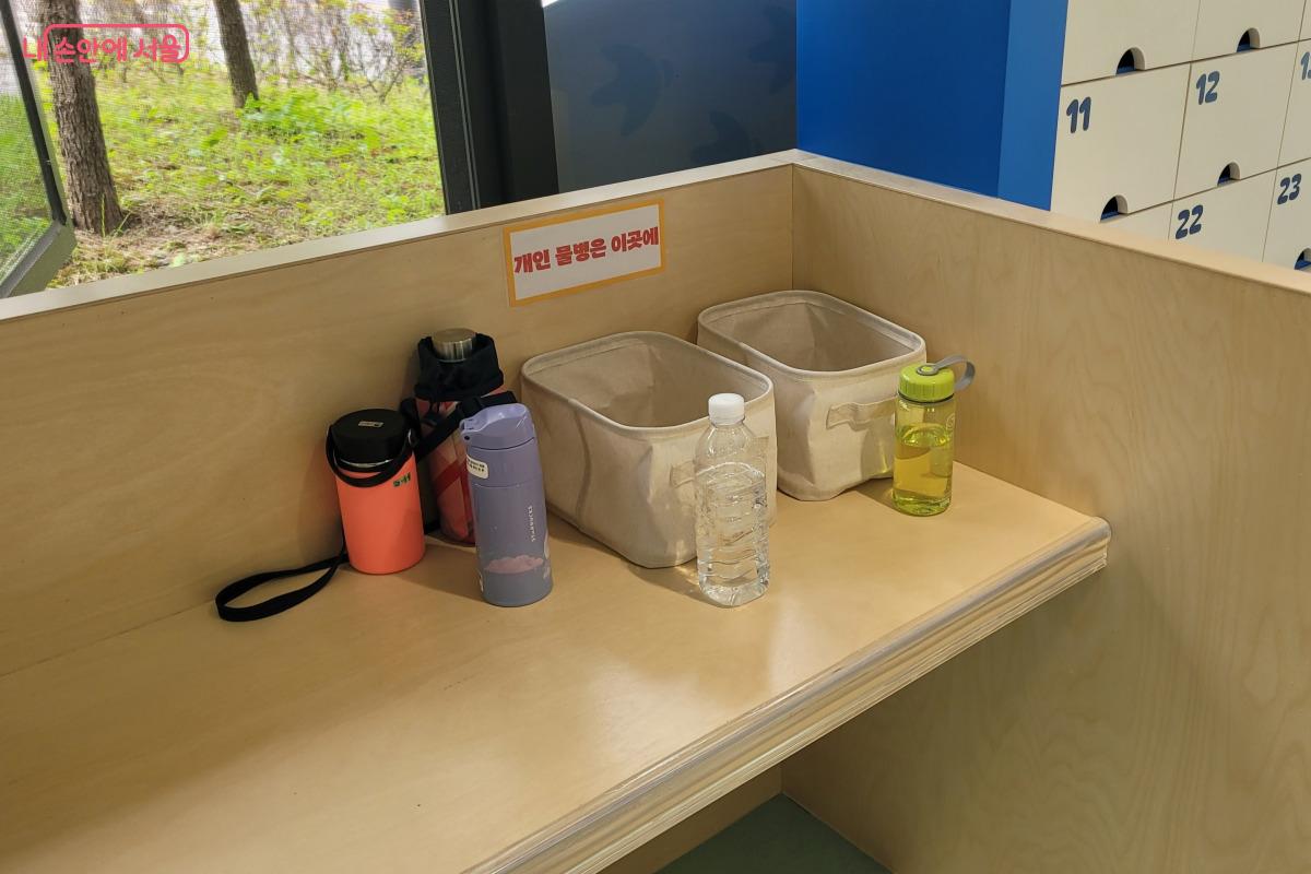 개인 물병을 가져가면 정수기에서 물을 받아 입구 쪽에 보관해 두고 마실 수 있다. ©김민지