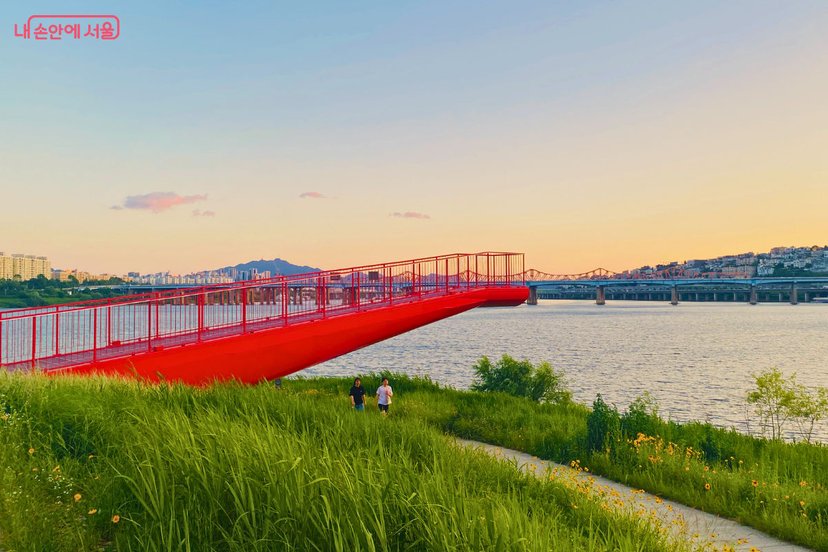 저녁 햇살이 강물 위로 비치면 전망대의 붉은 구조물과 함께 독특한 반영 효과를 연출하며, 방문객들에게 특별한 시각 경험을 선사한다. 일몰 후에는 전망대 조명이 자연스럽게 켜지며 야경 감상에 최적의 장소로 전환된다.