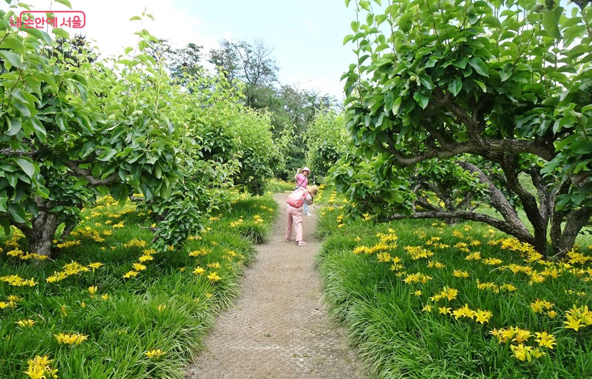 하늘꽃정원은 본래 배나무 과수원 자리였다. 배나무는 물빠짐이 원활한 초안산 같은 토양에서 잘 자란다고 한다. 덕분엔 서울에서 보기 드문 배나무숲을 볼 수 있다. 배나무를 이렇게 가까이에서 바라보기는 난생 처음이다. 복숭아 크기로 주렁주렁 달린 작은 배나무 열매들이 귀엽기만 하다.