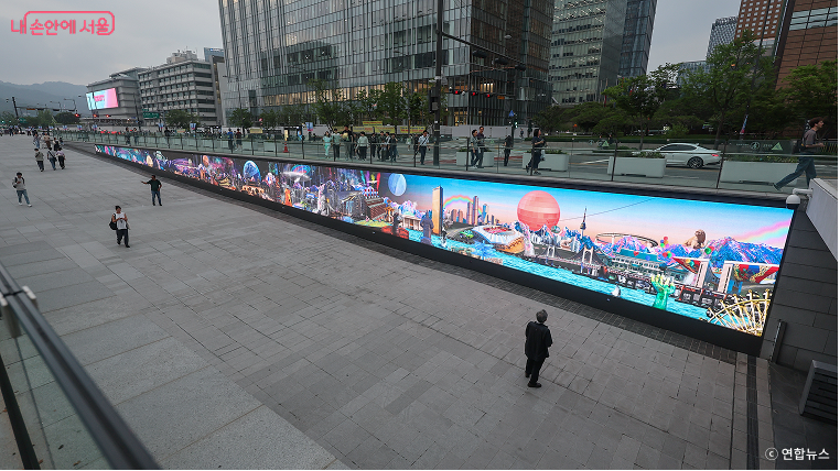 광화문광장에서 해치마당으로 이어지는 길목에 펼쳐진 53m 길이의 대형 미디어월인 해치마당 미디어월은 ‘해치 콘텐츠’, ‘계절콘텐츠’, ‘참여콘텐츠’, ‘전문작가 콘텐츠’로 여름을 새로운 시각으로 조명한다.