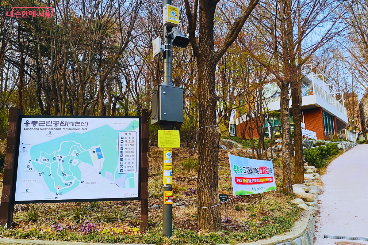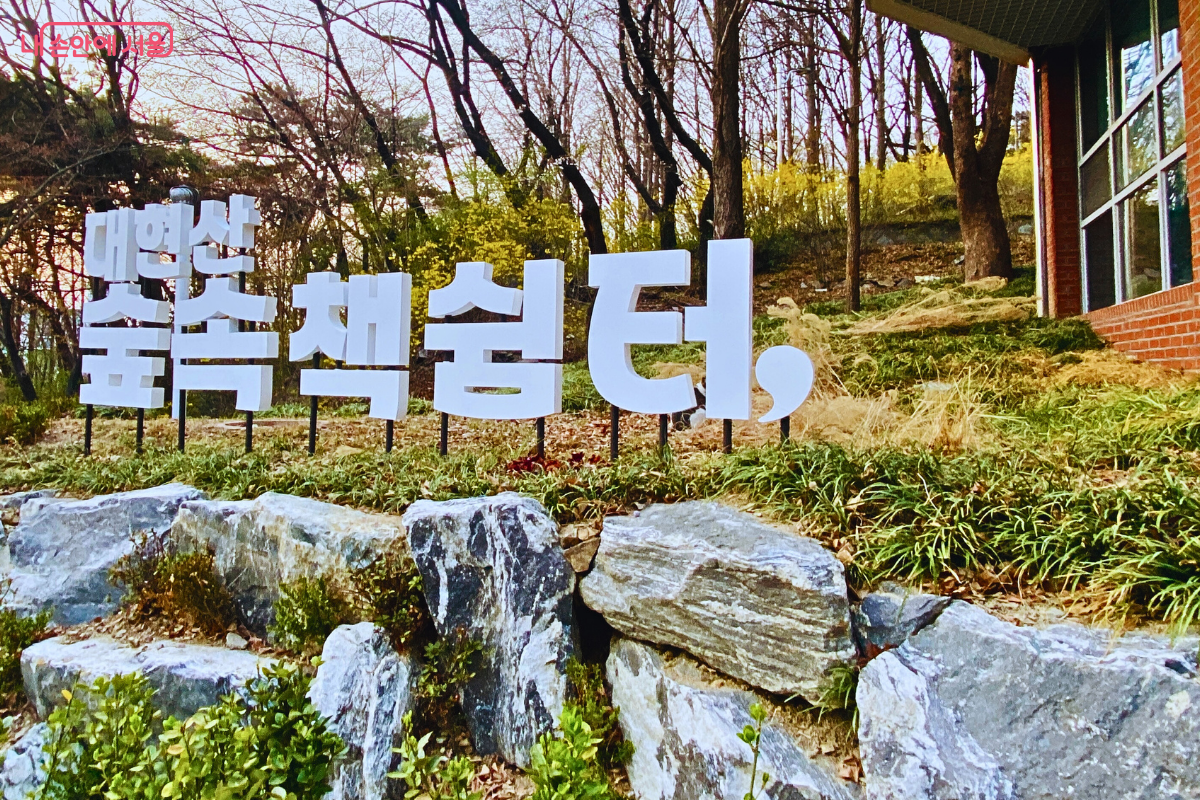 건물 옆 언덕에 위치한 대현산 숲속 책 쉼터 입간판이 반기고 있다. ©양정화