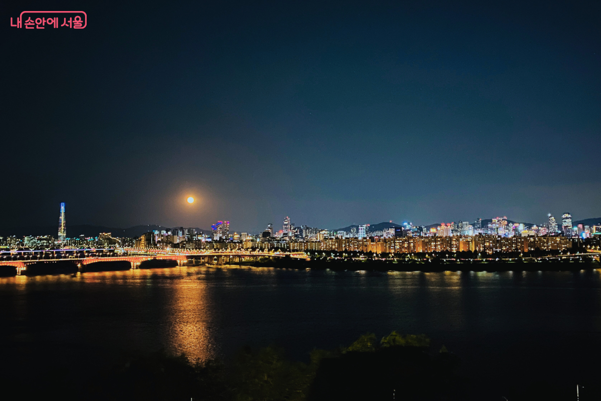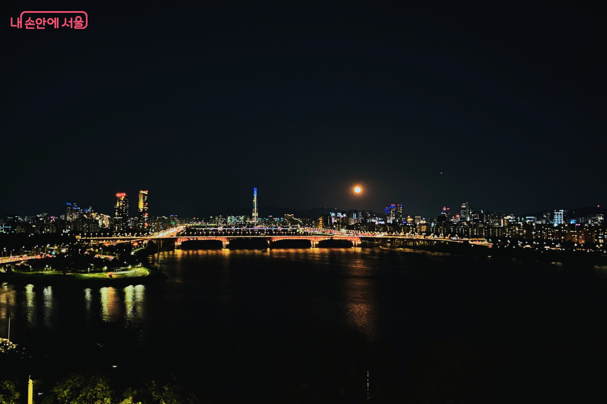 서울의 동쪽 스카이라인과 한강 위로 떠오르는 보름달 풍경이 도심과 조화를 이루고 있다. ©양정화
