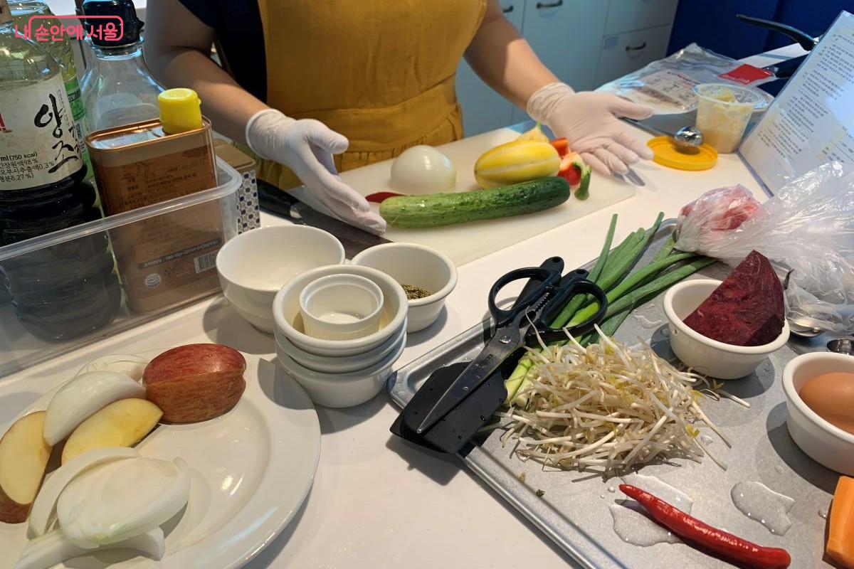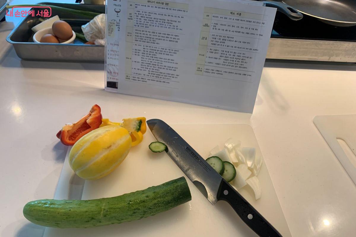 이론 교육을 마치고 본격적인 실습에 앞서 요리연구가의 시연이 진행됐다. 먼저 오이, 참외, 파프리카, 양파, 고추를 이용한 피클 만들기에 이어 돼지고기 숙주나물덮밥 요리를 위한 ▲육수 우리기 ▲양념 만들기 ▲달걀 풀기 ▲재료썰기 ▲재료볶기 ▲조리기 ▲밥 위에 올리기 전 과정을 상세하게 설명했다.