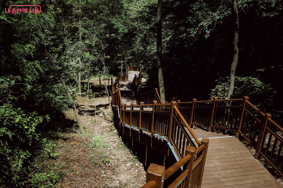 이름처럼 우거진 숲에 지그재그 길을 내서 조성된 데크 계단 ©김아름