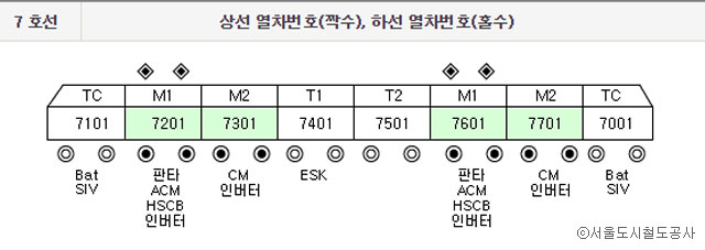 차량번호 역시 4자리로 구성되며 첫 자리가 노선번호, 3~4자리가 일련번호이다. 2번째 자리는 편성내의 순서이다. (지하철 편성량수는 지난 호 기사 참고) 즉 7042호 차량은 7호선 차량이고 42번째로 도입된 차량이며, 두 번째가 0번이라 한쪽 끝 차량을 말한다.