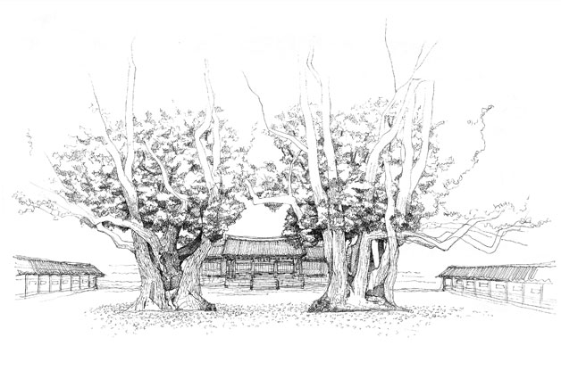 성균관의 공간은 크게 두 부분으로 이루어져 있다. 대성전을 중심으로 한 앞부분은 성현들에게 제사를 지내던 사당으로써의 공간이고, 명륜당을 중심으로 한 뒷부분은 공부를 가르치던 교육의 공간이다. 이를 전묘후학(前廟後學{)이라 하는데, 교육공간이 제사공간 앞에 있던 지방의 향교들과는 큰 차이를 보인다. 양쪽 영역에는 모두 커다란 은행나무가 심어져 있다. 예로부터 서원이나 향교에 이토록 은행나무가 일찌감치 자리를 잡았던 이유는 공자가 은행나무 아래서 제자들을 가르쳤다는 문헌상의 기원 때문이다. 학문을 닦는 곳을 행단(杏亶)이라 부르는 이유도 같은 맥락이다. 이 은행나무는 1519년(중종 14년), 당시 성균관의 수장이었던 대사성 윤탁이 심었던 것이라고 하니 500여 년이 다 되어가는 오래된 나무다. 가지는 많이 변형되기는 했지만 아직까지 모두 건강하게 잘 살아있어 역사의 깊이를 말해준다. 예나 지금이나 학생들의 배움에 대한 열의가 은행나무에게도 큰 양분이 되어온 건 아닐까.