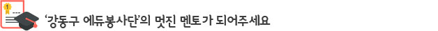 2011년부터 운영되고 있는 '강동구 에듀봉사단'도 뜻 깊은 참여 프로그램이 될 것 같습니다. 현재 에듀봉사단은 상담과 멘토링을 담당하는 담임선생님 개념의 '성인 봉사단'과 학습지도를 담당하는 '대학생, 고등학생 봉사단'을 나누어 운영하고 있습니다.
