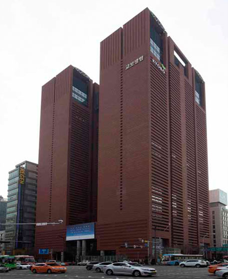 수많은 직장인들이 오가는 이곳에 아주 힘 있는 건물이 필요하다고 판단한 그는, 멀리서 보면 거대한 붉은 벽돌같이 보이는 단단하고 강인한 느낌의 건물을 완성했죠. 그러나 가까이서 본 교보타워는 좀 달라요. 쌍둥이 건물을 잇고 있는 투명한 유리 브릿지에서 부드러움을 느낄 수 있거든요. 그는 우뚝 선 쌍둥이 건물을 통해 인간의 육체를, 그리고 투명하고 개방적인 유리 브릿지를 통해 인간의 심장을 표현코자 했다고 해요. 이 유리 브릿지는 폐쇄된 느낌의 교보타워에서 유일하게 외부와의 소통을 보여주는 공간이죠.