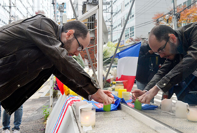 서울 서대문 주한 프랑스대사관 앞에 파리 테러 희생자들을 추모하는 촛불이 켜 있다
