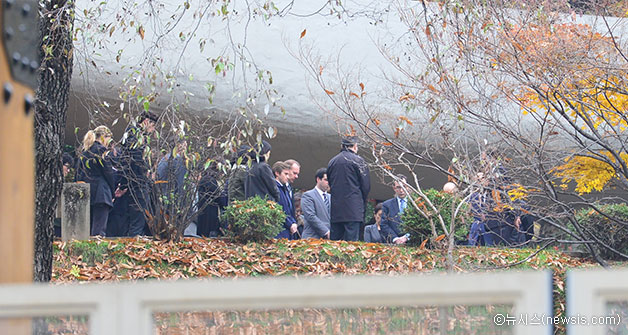주한 프랑스대사관 정원에서 파비앙 페논 대사와 관계자들이 희생자들을 애도하고 있다
