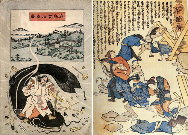 (좌)카시마대명신이 지진을 일으키는 메기를 제압하고 있다, (우)메기들이 사람들 도와 지진 피해 복구에 나서고 있다. 변화한 메기의 이미지가 보인다.