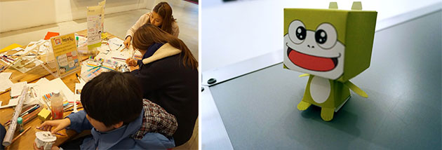재미랑에서 엽서를 색칠하고 캐릭터 페이퍼토이를 만드는 시민들(좌), 완성된 페이퍼토이(우)