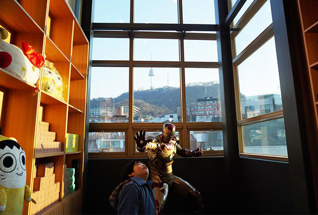 남산동 공영주차장에 도착하니 크게 웹툰이라고 쓰여 있는 웹툰공작소가 보였다. 4층에는 기념품가게와 작은 카페가 있다. 먹기에 아까운 ‘마음의 소리’의 캐릭터 얼굴 모양의 과자와 음료를 팔고 있었고, 창밖엔 N서울타워가 정면으로 보였다.