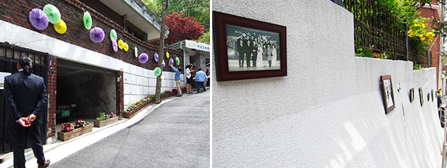 지하철 4호선 성신여대 입구에서 조선왕릉 정릉 바로 옆에 있는 정릉교수단지로 가는 마을버스를 탔다. 마을버스는 조선왕릉 정릉 입구를 향해 달렸다. 얼마 지나지 않아 담장 밑 양쪽으로 꽃길이 만들어진 교수단지 골목길이 왼편에 보이고 ‘정릉마을 정원결혼식’이란 안내 현수막이 보였다. 꽃길을 따라 올라가자 왼쪽 담장엔 종이꽃 장식이 걸렸고, 오른쪽 담장엔 흑백 결혼사진 10여 개가 액자에 담겨 걸려 있었다.