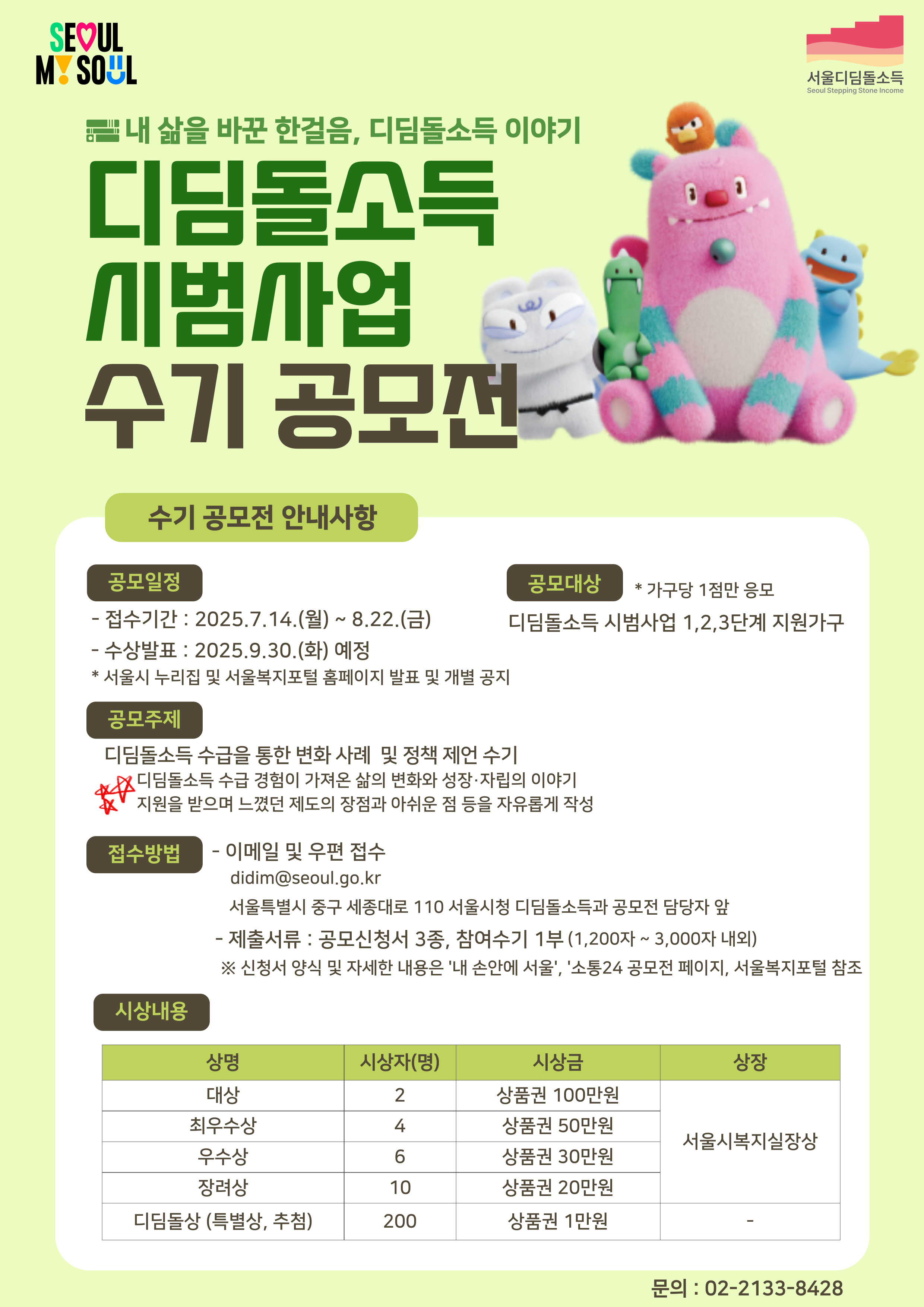 - 우편 : 서울특별시 중구 세종대로 110, 서울시청 디딤돌소득과 공모전 담당자 앞